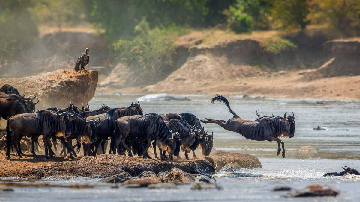 Maasai Mara, also sometimes spelled Masai Mara and locally known simply as The Mara, is a large national game reserve in Narok, Kenya, contiguous with the Serengeti National Park in Tanzania. It is named in honor of the Maasai people. The Greater Mara ecosystem encompasses areas known as the Maasai Mara National Reserve, the Mara Triangle, and several Maasai Conservancies, including Koiyaki, Lemek, Ol Chorro Oirowua, Mara North, Olkinyei, Siana, Maji Moto, Naikara, Ol Derkesi, Kerinkani, Oloirien, and Kimintet. Masai Mara is one of the most famous and important wildlife conservation and wilderness areas in Africa. Wildebeest are the dominant inhabitants of the Maasai Mara, and their numbers are estimated in the millions. Around July of each year, these animals migrate north from the Serengeti plains in search of fresh pasture and return to the south around October. The Great Migration is one of the most impressive natural events worldwide, involving some 1,300,000 blue wildebeest, 500,000 Thomson’s gazelles, 97,000 topi, 18,000 common elands, and 200,000 Grant’s zebras. All members of the “Big Five” – lion, African leopard, African bush elephant, African buffalo, black and white rhinos – are found here all year round. Hippopotamuses and Nile crocodiles are found in large groups in the Mara and Talek rivers. The plains between the Mara River and the Esoit Siria Escarpment are probably the best area for game viewing, in particular regarding lions and cheetah. Lions are the most dominant and are found here in large numbers. Spotted hyenas are another abundant carnivore, and will often compete with lions for food. Smaller carnivores that don’t directly compete with the latter include African wolves, black-backed jackals, African striped weasels, caracals, servals, honey badgers, aardwolves, African wildcats, side-striped jackals, bat-eared foxes, Striped polecats, African civets, genets, several mongoose species, and African clawless ottersAntelopes can be found, including Grant’s gazelles, impalas, duikers and Coke’s hartebeests. The plains are also home to the distinctive Masai giraffe. The large roan antelope and the nocturnal bat-eared fox, rarely present elsewhere in Kenya, can be seen within the reserve borders. Birds that call this area home for at least part of the year include vultures, marabou storks, secretary birds, hornbills, crowned cranes, ostriches, long-crested eagles, African pygmy-falcons and the lilac-breasted roller, which is the national bird of Kenya.